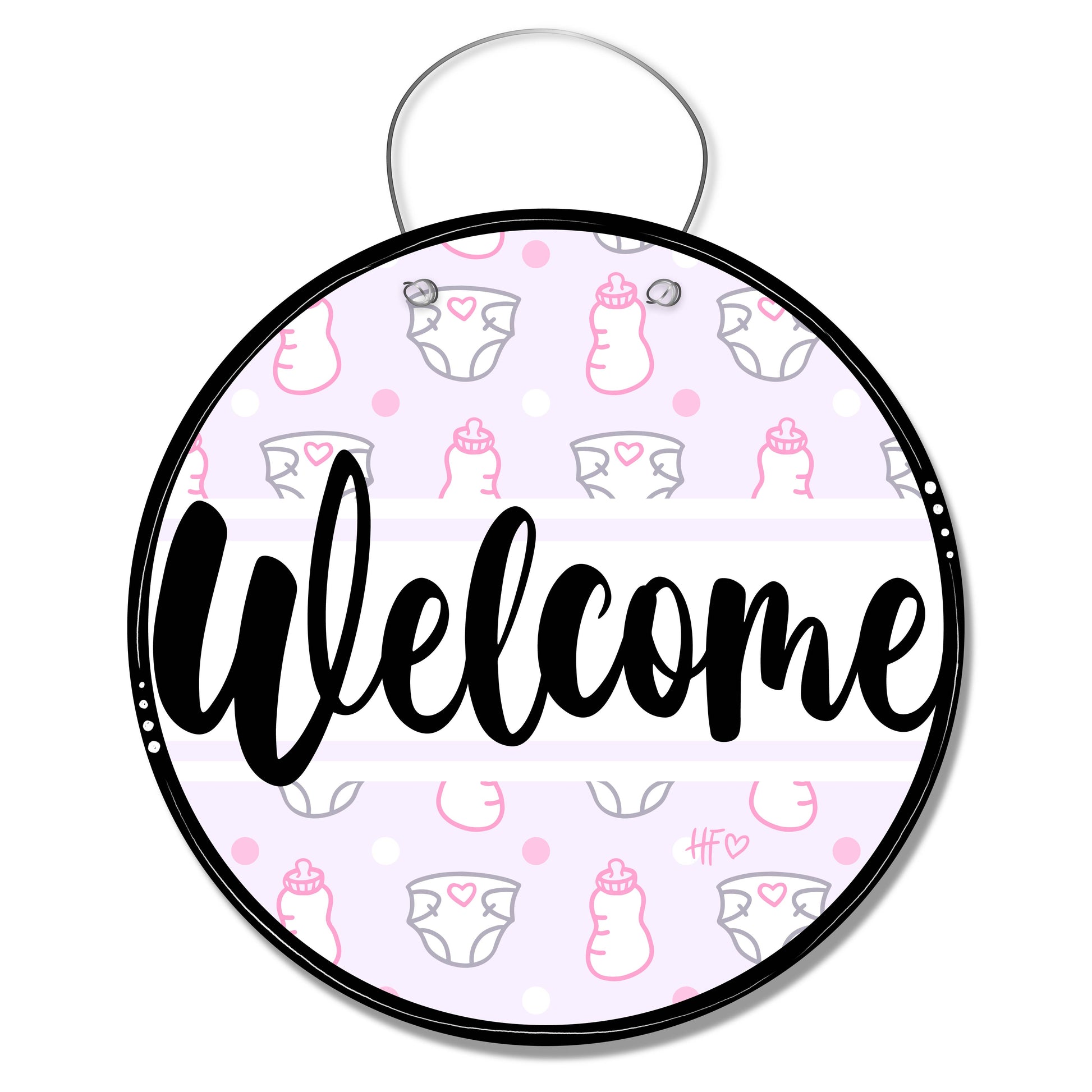 This Welcome board is the sweetest way to announce a precious baby girl. With soft blush and lavender tones, playful diaper and bottle patterns, and bold script lettering, it feels tender, joyful, and full of love. A darling front door celebration for your newest little princess. 💗 👶 🎀