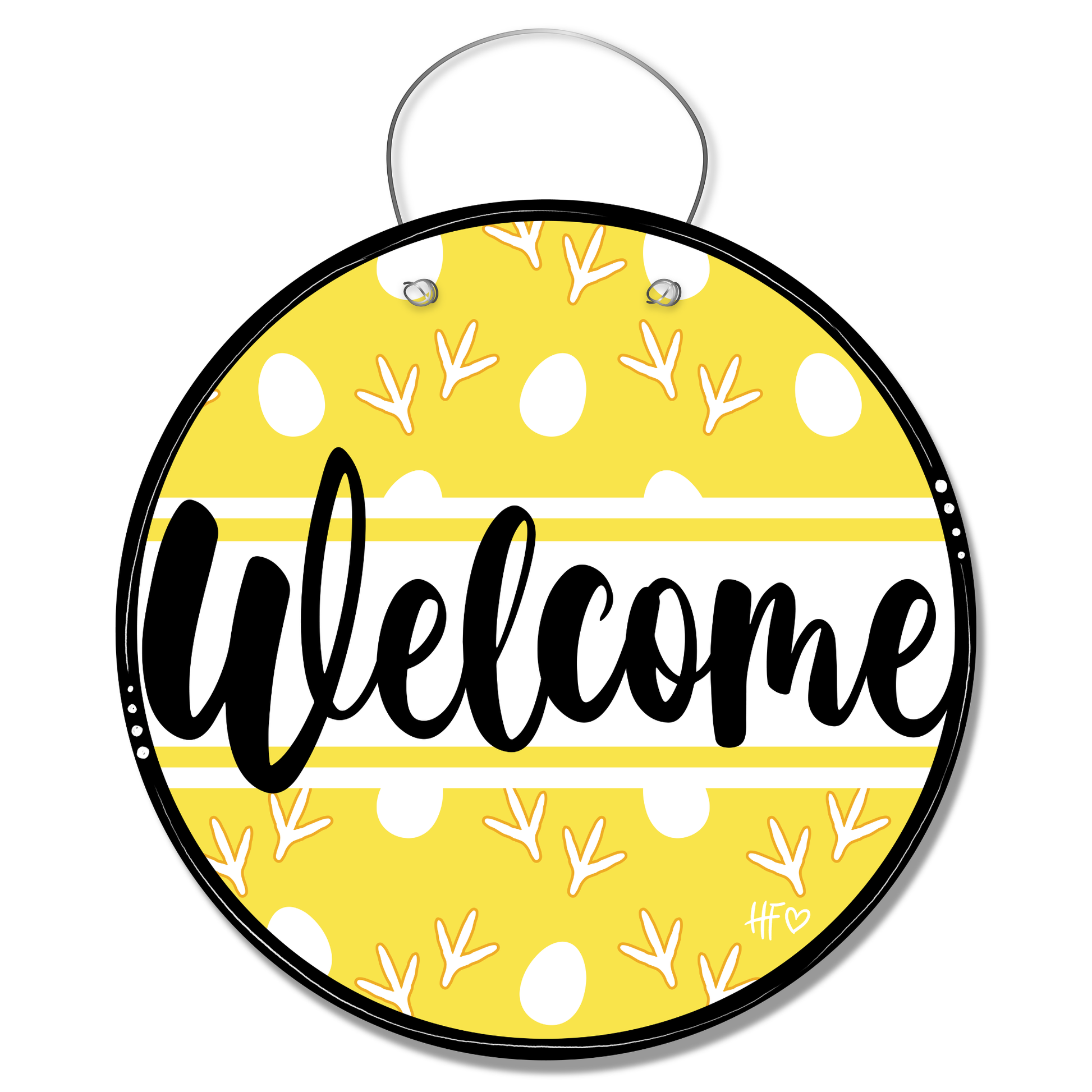 This round chicken “Welcome” door hanger brings bright farmhouse cheer to your front porch with its sunny yellow background, playful chicken tracks, and sweet egg details 🐔🥚💛; bold script across the center keeps it classic while the fun print adds personality, making it perfect for chicken mamas, backyard coop lovers, and anyone who believes a happy home starts with fresh eggs and a warm welcome 🏡✨