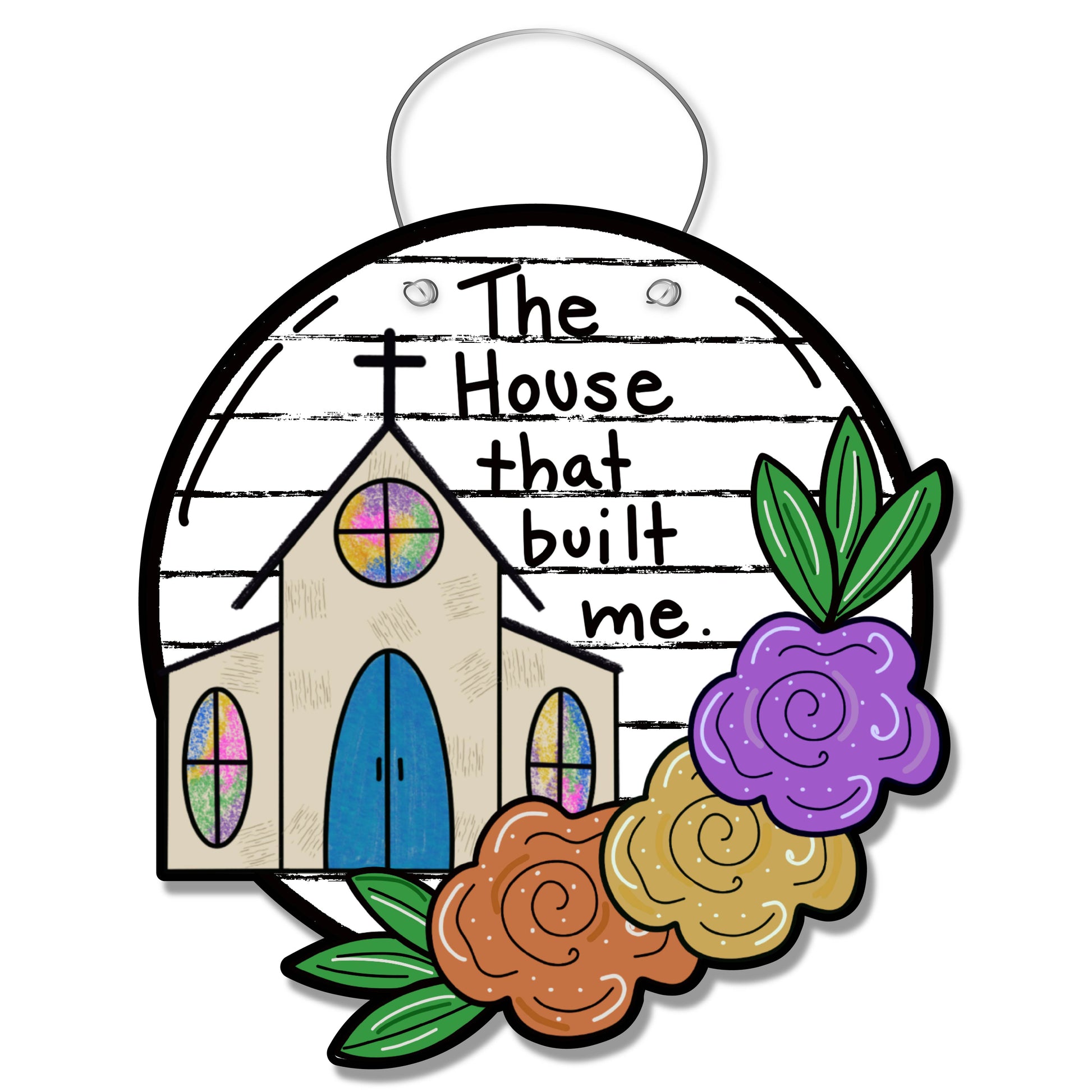 Picture this as your Easter refresh of āThe House that built meā round door hanger: a soft white shiplap background with subtle pastel distressing, the same sweet church silhouette but with light cream walls and a blush-pink roof, and stained glass windows glowing in spring hues like lavender, butter yellow, and robinās egg blue; swap the darker florals for a cheerful cluster of tulips, daisies, and a few tucked-in speckled Easter eggs at the base, add a tiny bunny silhouette near the steps for a playful touch, and soften the lettering to a gentle charcoal or muted sage so it feels airy and hopeful, like the first Sunday morning after a long winter š·š£āØ.